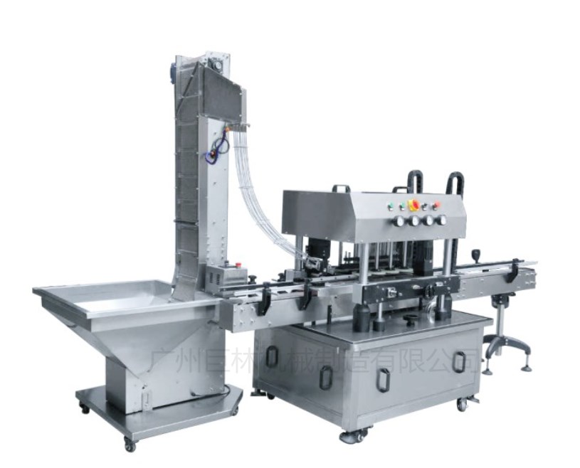 3、瓶子在向前运行的过程中,上盖器自动下盖,瓶盖被四组搓盖轮自动拧紧。既可用于单机生产,故障自动停机,更是连线生产的理想机型。