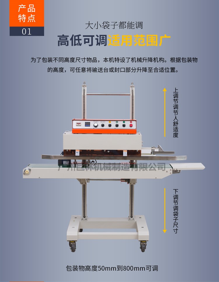 本机适用于任何以热封材料的封口。速度无级可调,恒温控制,温度可调,输送台高低可调,适应范围极广泛。